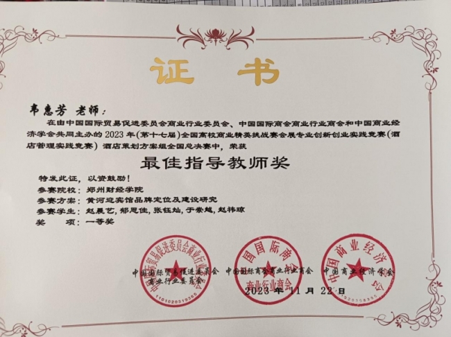 近日,从2023年第十七届全国高校商业精英挑战赛会展专业创新创业实践竞赛(酒店管理实践竞赛)主办方获悉,11月18日,由中国国际贸易促进委员会商业行业委员会、中国国际商会商业行业商会与中国商业经济学会共同主办的2023年第十七届全国高校商业精英挑战赛会展专业创新创业实践竞赛(酒店管理实践竞赛)总决赛分组赛成绩揭晓,BEAT365官网管理学院2021级酒店管理专业参赛队在比赛中表现优异,其中“深藏blue队”夺得全国总决赛一等奖,“超级梦想家”参赛队获河南省赛三等奖。