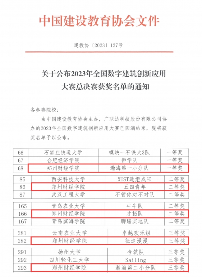 12月22日,2023年全国数字建筑创新应用大赛获奖名单公布,土木工程学院代表队在全国本科组2000余支队伍中脱颖而出,斩获一等奖1项,二等奖2项,三等奖2项。