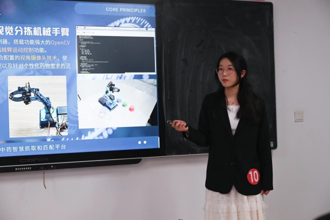 开幕式后,各参赛选手分别在育爱楼404教室、406教室、408教室进行终审决赛答辩。本次大赛共有55支优秀团队进行激烈角逐,参赛选手从作品研究的意义、研究过程、研究成果、作品的创新点等方面进行PPT演示,展示参赛项目的亮点与特色。