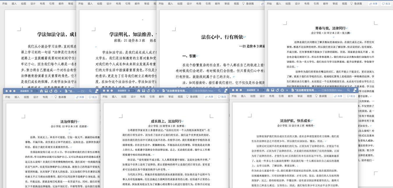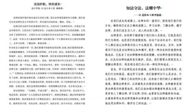 为教育引导学生人人知法、人人守法,牢固树立法治观念,切实提升师生法治意识和法治素养,围绕“学法知法守法 成长成人成才”组织开展征文活动。活动期间,各学院广泛动员,引导学生自主查阅资料文献学习法律法规及法治社会建设相关内容,结合新时代大学生的使命与职责,深入思考,积极创作。
