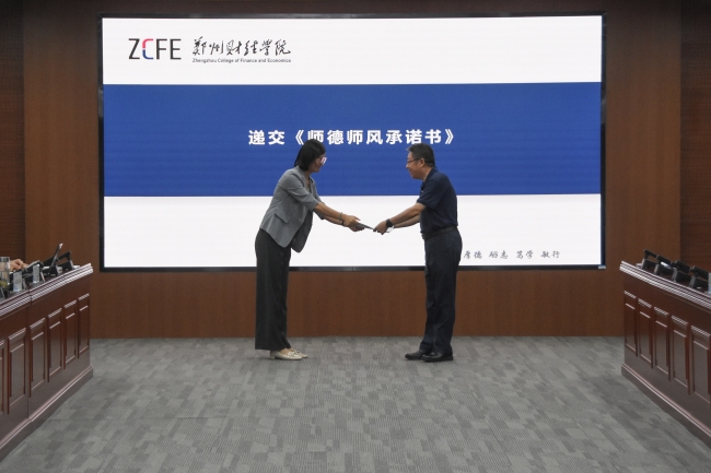 全体参会人员在党委教师工作部副部长赵晓宇的带领下重温《河南教师誓词》,大家高举右拳,郑重宣誓,誓言声声,表达了对教育事业的忠诚与热爱,以及为培养德智体美劳全面发展的社会主义建设者和接班人而不懈奋斗的决心。随后,学校职能部门、二级学院负责人代表分别向党委书记马治军递交了《师德师风承诺书》。