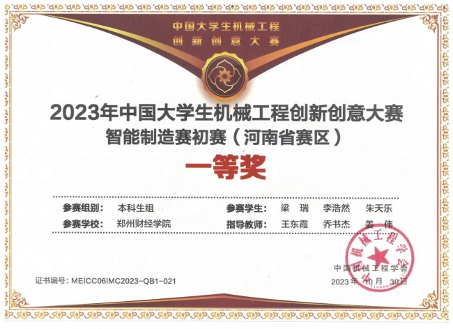 梁瑞与团队成员荣获“2023年中国大学生机械工程创新创意大赛智能制造赛初赛”一等奖