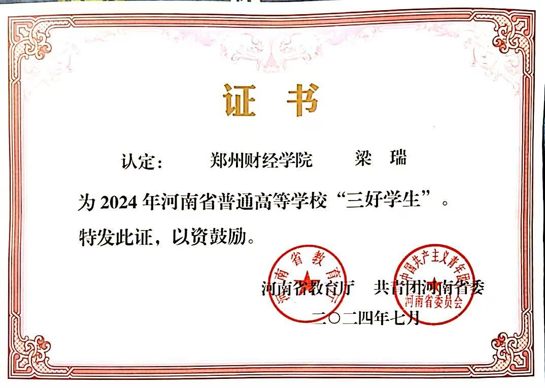 梁瑞同学被评为河南省“三好学生”