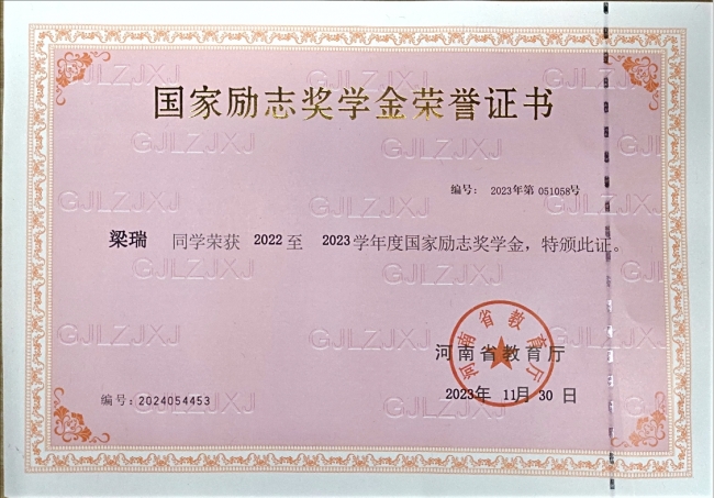 梁瑞同学荣获“国家励志奖学金”