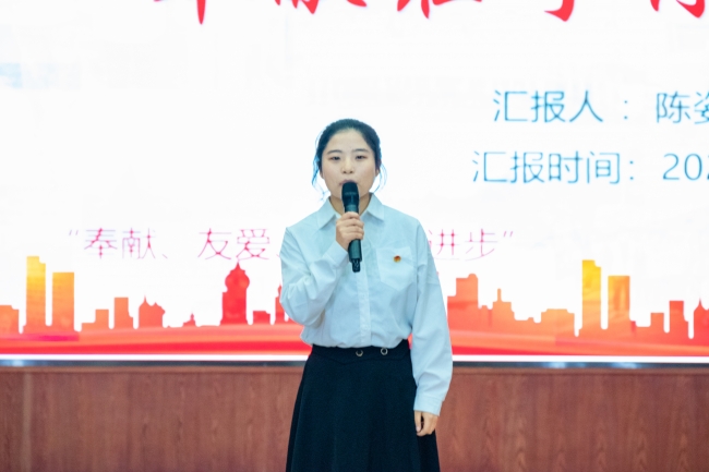 “小绿伞”防溺水志愿服务实践团学生代表胡馨瑶、“种果青年”中国精神志愿宣讲团学生代表韩家赢、2024年度青年志愿者标兵代表陈媛媛、2024年度青年志愿者标兵代表陈姿茹进行汇报展示。她们围绕理论宣讲、红色文化、基层服务等方面展开汇报,展示出自身在志愿服务中的收获与成长,并呼吁全校青年学生积极投身志愿服务,以实际行动践行青春誓言,共绘志愿服务新蓝图,为社会进步贡献青春力量。