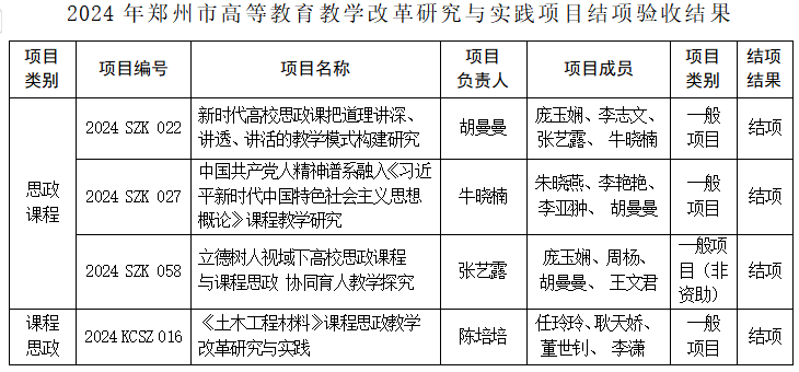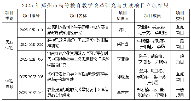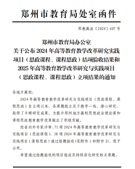 近日,郑州市教育局发布《关于公布2024年高等教育教学改革与研究实践项目(思政课程、课程思政)结项验收结果和2025年高等教育教学改革研究与实践项目(思政课程、课程思政)立项结果的通知》(郑教高函〔2024〕607号)。BEAT365官网在2025年项目立项中获批立项思政课程类3项、课程思政类2项。在2024年项目的结项验收中,思政课程类3项和课程思政类1项均顺利通过。
