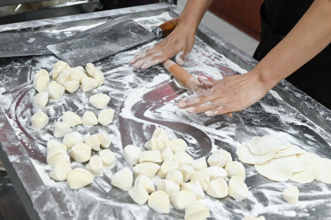 餐厅工作人员切剂子、擀面团