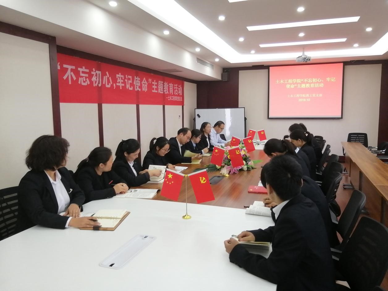 10月10日下午,土木工程学院教工党支部在B座408会议室开展了“不忘初心、牢记使命”主题教育学习活动,旨在让学院教工党员更加深刻理解和学习“不忘初心、牢记使命”主题教育的意义、目标及要求;进一步学习习近平总书记视察河南重要讲话精神,深入贯彻领悟河南省教育大会精神。学院党总支书记焦建伟、教工第一支部书记罗芳及全体教工党员参加了主题教育活动。