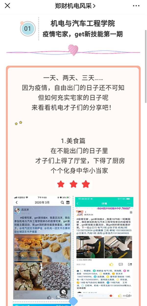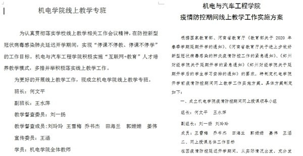 一场突如其来的疫情使我们不得不推迟开学。机电与汽车工程学院积极响应“停课不停学”号召,在学校的统一部署下,学院领导班子提前谋划,整合资源,成立线上教学领导小组和线上教学专班;教师积极准备在线课程,探索实践新型教学形态;辅导员不辞辛劳隔空管理学生;团总支开展丰富多彩的团学活动,做好学生思想教育引路人。全院精诚团结,形成合力,为线上教学保驾护航。