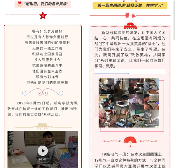 青年是国家的未来,民族的希望,为让学生增强爱国情怀,带领过学生青年通过开展《谢谢您,我们盖世英雄》系列活动,引导青年了解身边的榜样,鼓励青年学习榜样。在这个特殊关键时刻,号召机电学院青年学子志愿者加入到抗“疫”一线当中去,用自己练就的过硬本领和知识奉献基层,扛起时代赋予的使命和担当。
