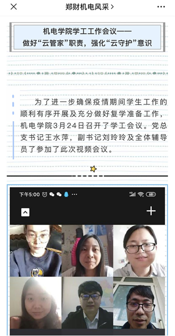 自疫情发生以来,学院领导班子为筹划线上教学工作召开了十几次视频会议,研究方案,制定策略,保障了学院云课堂的有序开展。院长、书记亲自指导老师怎么使用线上教学工具;线上教学如何备课;如何在家开展科研工作、申报项目等;如何疏导学生心理,加强疫情期间的学生管理等一系列工作。