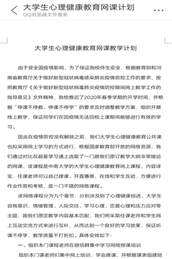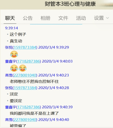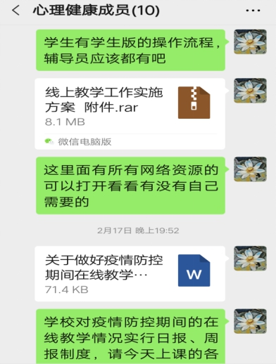 疫情防控期间,大学生心理健康教育课程组迅速行动,集思广益,创新课堂教学新模式。根据学校和学院的要求及时调整课程教学方案,组织开展线上教学,并将此次疫情作为线上课堂教学的素材,促进学生与灾难共成长,增强心灵韧性。