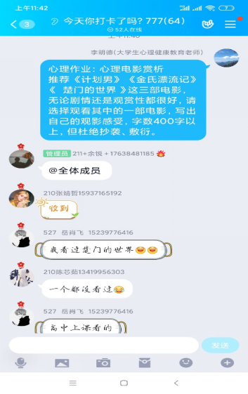 本学期心理健康教育课程有一大部分是合班课程,大班容量的线上教学不同于传统的线下教学,教师不易看到屏幕对面学生的全貌。为了调动学生的学习积极性和主动性,大学生心理健康教育课程组老师们利用碎片时间和每周二下午的教研活动时间,商讨如何激发学生学习兴趣、如何保证学习效果。通过设置实时互动、摇一摇提问、抢答、投票、主题讨论、单元测试、课后作业分享一系列的线上互动,让学生感受到学习的现场感和真实感,感受到同学榜样的学习精神,刺激学生多感官参与,从而达到更好的学习效果。