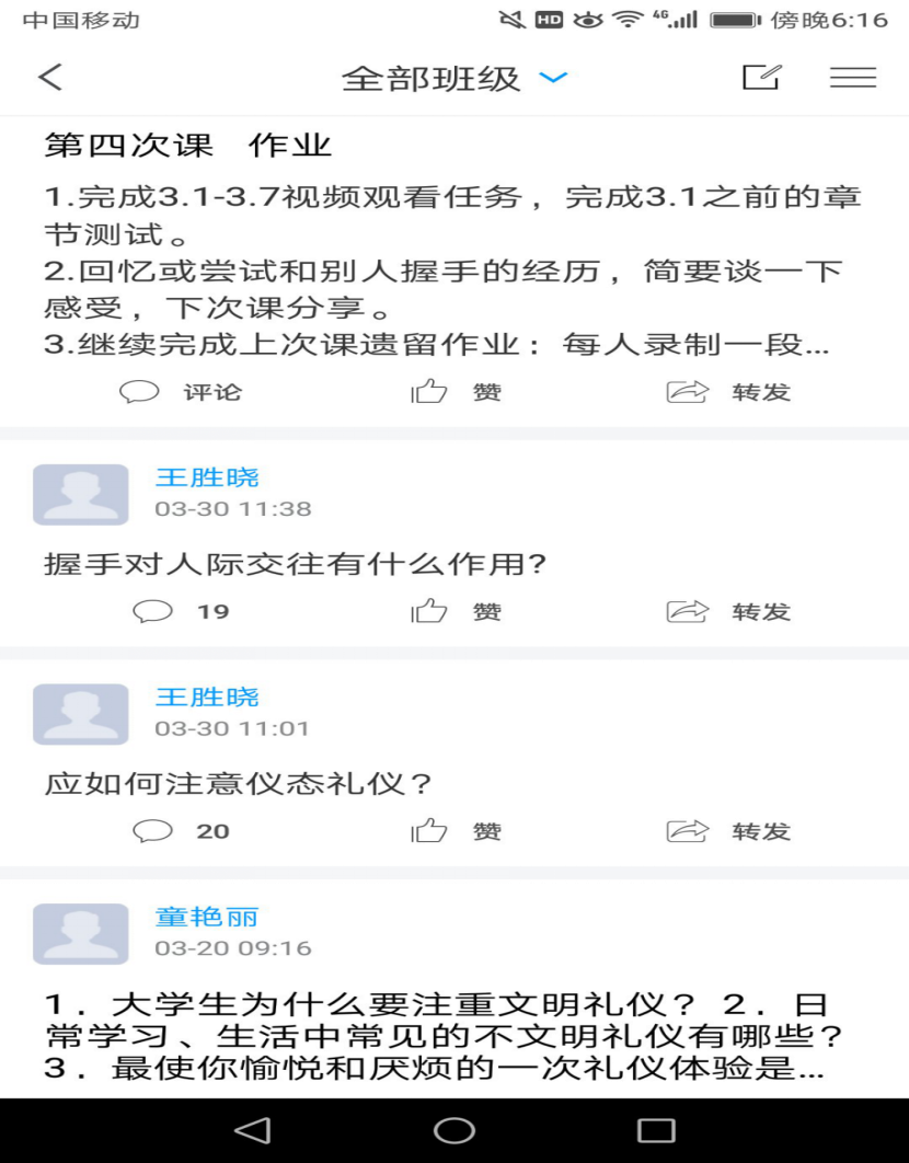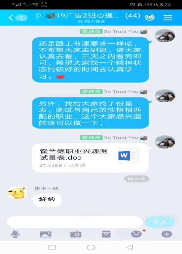 线上教学开展过程中,团队教师充分利用学习通、QQ家校群等多种软件平台进行授课,确保教学任务的顺利进行。课前给学生发布相应视频点的学习任务,让学生在每一次上课前做到心中有数。正式上课前通过学习通,发布签到信息,掌握学生到课情况。上课中利用语音或群聊模式讲解课程内容,发放主题讨论和选人、抢答等活动,提高学生的课堂参与度,课后在QQ家校群和学习通平台发布课堂学习材料和课后推荐阅读书目,督促学生完成相应视频学习和章节测验,并及时进行督促、批阅。同时,在疫情期间把课程思政融入到课堂教学中,把疫情当教材,对学生进行行为能力上的积极引导,保证教学效果和学生思政教育水平同步提升。