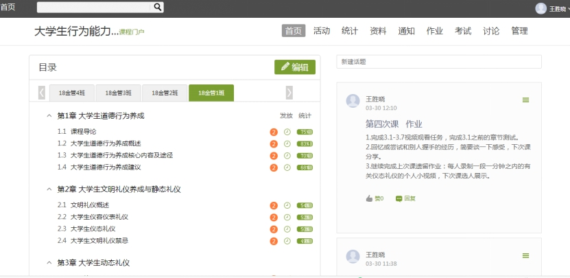 行为能力养成课程于2018年建设为校级精品在线开放课程,疫情期间,大学生行为能力养成教学团队在课程负责人王胜晓老师的带领下,齐心协力、献计献策,严格贯彻落实学院“延期开学不停教、不停学”的工作方针,全力准备课程的线上教学工作。线上教学正式开课前,在课程负责人的牵头下,课程团队利用QQ、微信等沟通平台,统一思想,安排线上教学计划,部署线上教学具体措施。在课程开课前完成了制订线上教学计划进度,完善已搭建好的学习通课程平台,导入本学期课程开设的64个教学班(含合班)3700余名学生信息,完成教师教学班级的分配等任务,同时,团队成员充分发挥了互相协作,以老带新的工作作风,教学团队中的老教师指导新进教师熟悉课程、熟悉学习通教学平台的操作等,确保团队中每一位教师都能高质量完成课程的教学任务。