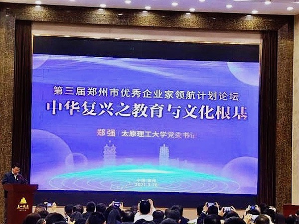 会议现场 本次论坛特邀太原理工大学党委书记郑强教授主讲,他以“中华复兴之教育与文化根基”为题,从公平教育、科学教育、信仰教育等方面展开,结合详实的案例,深入浅出地分析了高校建设、人才培养对于地方乃至国家的重要性,讲述生动幽默、热情洋溢,具有很强针对性和启发性。 郑强教授强调,精神的养成是大学教育的核心,要加强大学生爱国主义教育,弘扬中华优秀传统文化,增强文化自信,引导大学生树立正确的人生观和发展观。 郑强教授是国家杰出青年科学基金获得者、“新世纪百千万人才工程”国家级人选、享受政府特殊津贴专家,长期从事高等教育管理工作。近年来,他受邀到全国多个省市高校、机关进行讲演,主要涉及爱国教育、人才培养等相关话题,深受广大青年群体、高校教师、企业家、社会各界的欢迎。