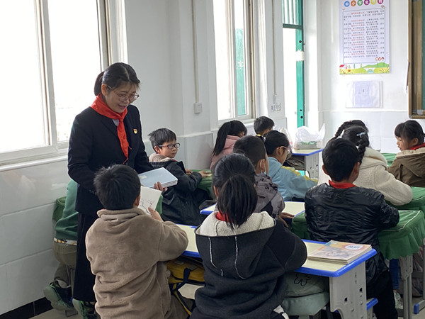 学院党总支书记袁雪霞为小学生发放学习用品