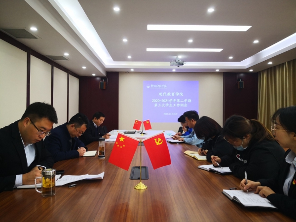 3月26日上午,现代教育学院在A608会议室召开本学期第三次学生工作例会,学院党总支书记丁青山、副书记曹亮、团总支书记胡亚东和全体辅导员参会。会议由曹亮主持。 学生工作例会现场 会上,曹亮简要总结了学院近期的学生工作,并对辅导员年度人物评选、最美辅导员评比活动、毕业生“三个一”主题教育活动、学生心理状况排查、首届心理剧大赛等工作进行了再部署、再推进。他强调,辅导员要经常深入班级和宿舍,多关心学生的学习、生活,关注学生的思想动态;严格执行值班制度,保持手机畅通;各项学生工作要抓实抓细、落到实处,对各类学生活动要积极动员、加强指导。 胡亚东传达了3月25日学校团委工作会议精神,并对卓越学子表彰、青年大学习、“活力杯”共青团基层基础工作大赛等团务工作进行了安排部署。