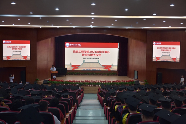百年恰风华,逐梦新征程。6月20日下午,信息工程学院2021届毕业典礼暨学位授予仪式在图书馆学术报告厅举行。信息工程学院院长刘於勋、党总支书记袁雪霞、副书记张永、副院长刘远超、副院长邢丹丹及学院全体教师、2021届本科毕业生等500余人参加毕业典礼。典礼由党总支副书记张永主持。