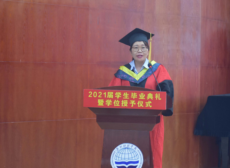 伴随着庄严的国歌声响起,毕业典礼拉开帷幕。学院党总支书记袁雪霞致辞,她代表学院向2021届学生圆满完成学业表示热烈祝贺。她指出,今年是建党100周年,同学们在党的百年华诞这一重要历史时刻完成学业,是与新时代同向同行的幸运一代,意义非同寻常。她勉励毕业生厚植爱党爱国情怀,弘扬艰苦奋斗精神。不忘初心,做一个有理想的追梦人。