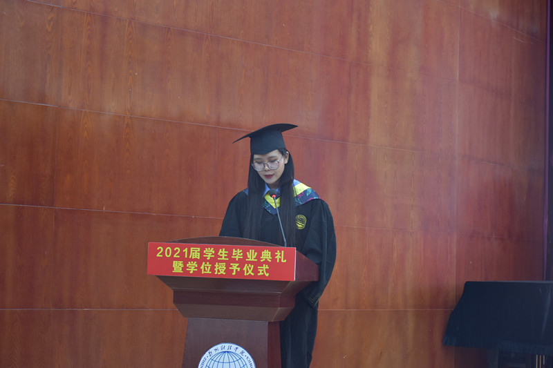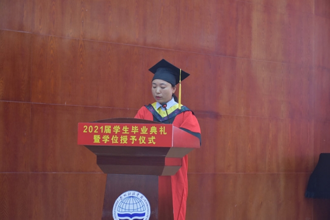 学院毕业生代表17软件工程本1班马玉柔同学发言。她细数在校学习四年期间的感动与收获,话语里溢满对母校、老师的无限感恩之情。作为郑财学子,她表示要始终铭记“厚德,砺志,笃学,敏行”的校训,心怀国家、感恩社会。肩负国家的希望,奔赴下一段征程。