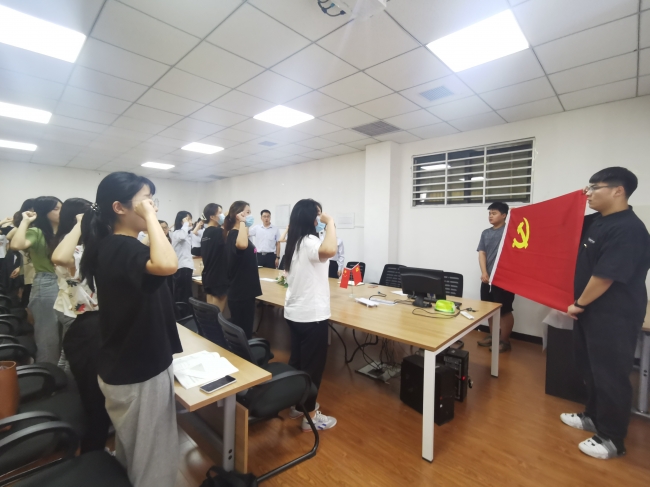 大会在庄严肃穆的国际歌声中拉开帷幕。首先,学生党支部书记孙倩宣读了预备党员名单。随后,教师党员常伟华带领30名预备党员进行宣誓,参会老党员也重温了入党誓词。