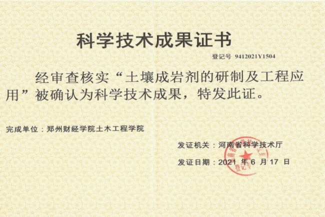 2021年6月,土木工程学院与郑州赛诺建材有限公司合作项目“环保型矿渣粉混凝土骨料研制及工程应用”和“土壤成岩剂的研制及工程应用”,分别通过河南省科学技术厅的验收审核,并取得科学技术成果证书。