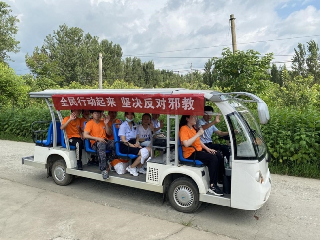 “反邪教联盟”暑期社会实践团队员一行前往遂平县窗户台村乘坐观光车宣传反邪教知识,游览车在村中一遍遍绕行,铿锵有力的反邪声音回荡在村庄上空,也铭刻在村民心中。反邪教宣传深入人心,不仅增强了村民识别邪教、抵制邪教的意识和能力,还营造了积极向上、健康和谐的居住环境。