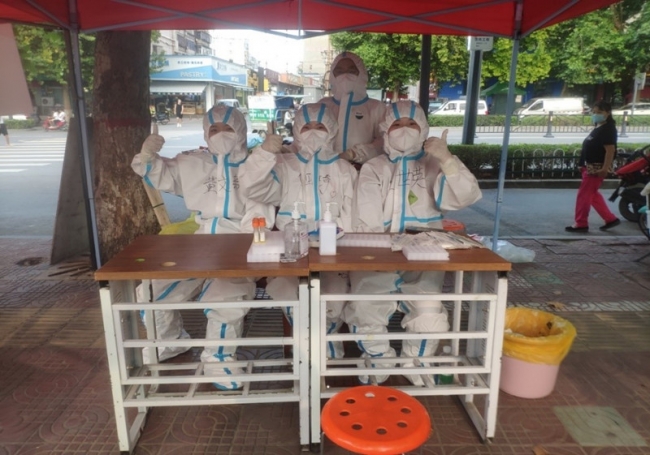 申盘龙(左一)在核酸检测现场给居民测量体温