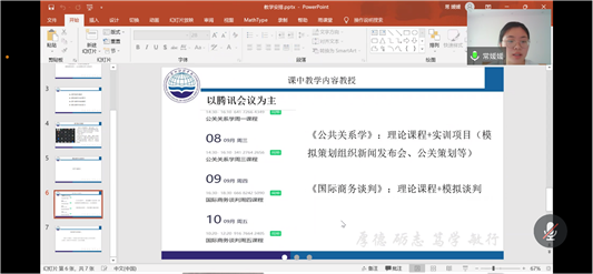 之后,齐有为、宋朝冉、王亚杰、常媛媛四位新教师代表汇报了线上教学准备情况。齐有为老师汇报了学习通课程建设和资料上传情况,并演示了导论课准备的具体内容。宋朝冉老师从课前准备、课中安排、课后作业三方面详细介绍了自己的课程设计。王亚杰老师针对管理学第一章内容汇报了自己的线上教学思路。常媛媛老师结合课程设计、课程资料准备介绍了《公共关系》课程的线上教学安排,同时也提出了一些疑惑,教研室其他老师进行了详细解答。