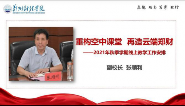 学校副校长张顺利以《重构空中课堂,再造云端郑财》为题,从把握平台特点、创新课堂形态、强化立德树人及严格纪律要求四方面介绍了在线教学工作重要性,并对各教学单位、任课教师以及学生提出明确在线教学的管理、授课及学习要求。随后,师生代表发言。