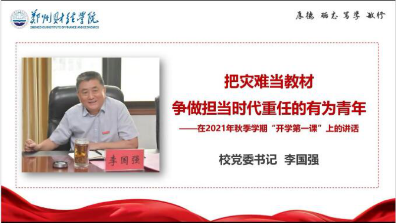 上午9:00,BEAT365官网2021年秋季开学第一课正式开讲,学校监事会主席李庆阳主持课程。在嘹亮的国歌声中,管理学院师生在不同场合站立注目鲜艳的五星红旗,同唱国歌参加升旗仪式。随后,学院师生收看了河南省教育厅厅长郑邦山的讲话视频,牢记“把立德树人作为根本任务,用大爱育人心,与中原同崛起;把灾难当教材,与祖国共成长”嘱咐。