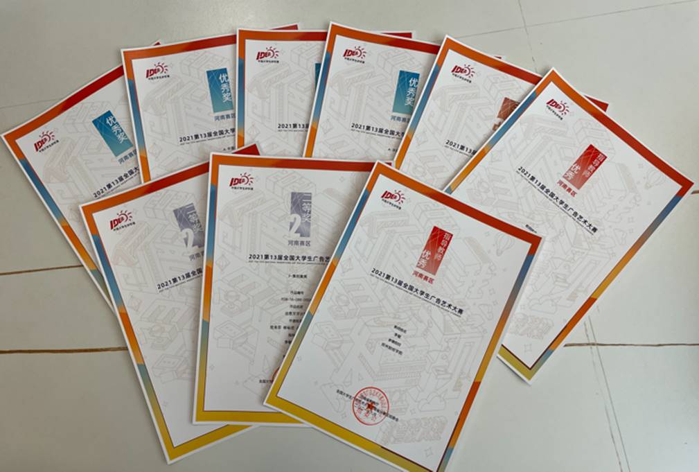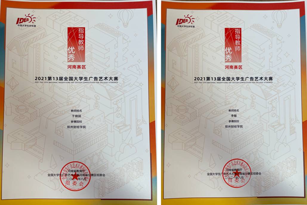 近日,“中国大学生好创意”第13届全国大学生广告艺术大赛落下帷幕,在文化与传媒学院于晓娟老师、王钰涵老师、李敏老师的组织和指导下,学院学生积极参赛,努力拼搏,在比赛中斩获河南赛区二等奖2项、三等奖1项、优秀奖4项,同时于晓娟、李敏两位老师被授予“优秀指导教师”称号。