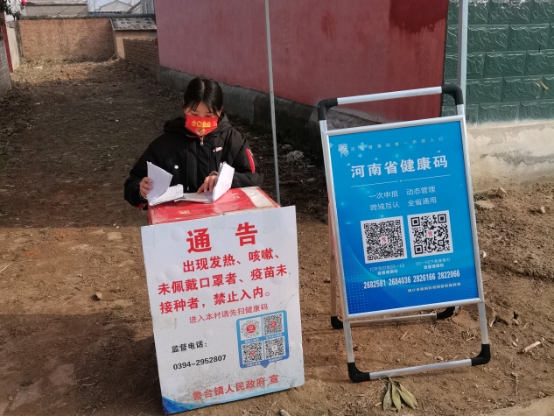 2019级金融学本科4班张鑫在河南永城还金湖社区参加志愿服务工作。她在村干部的领导下,值守在主要十字路口,并向村民们介绍可能感染的途径以及如何正确预防,在现场演示如何正确洗手和佩戴口罩。她说:“我会尽自己所能协助村委会开展疫情防控工作,相信在大家的努力下,我们一定会取得最终的胜利!”