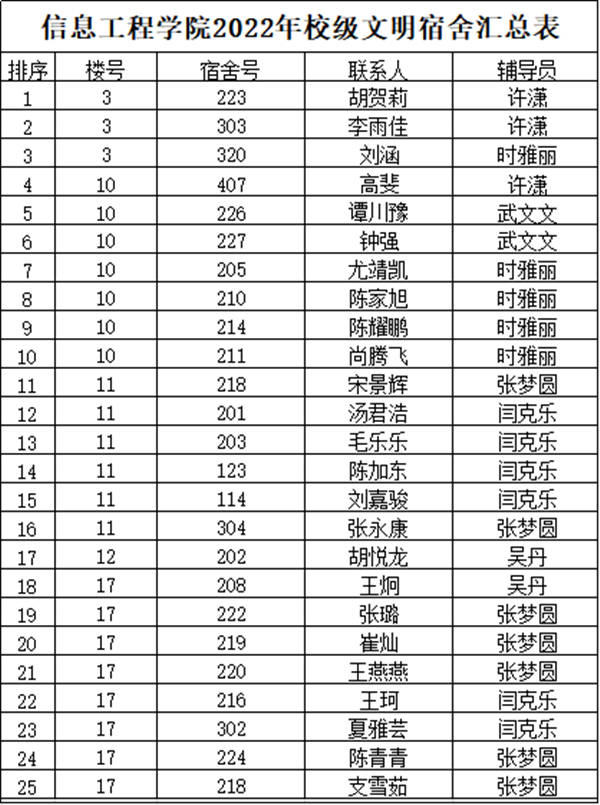 5月10日至15日,信息工程学院开展“文明宿舍”评选活动,综合考察宿舍检查结果、活动参与情况和成员的学业发展情况,挖掘品学兼优的优秀宿舍。经过公平、公正、公开的评比,最终共选出25个校级“文明宿舍”,起到较好的示范作用。