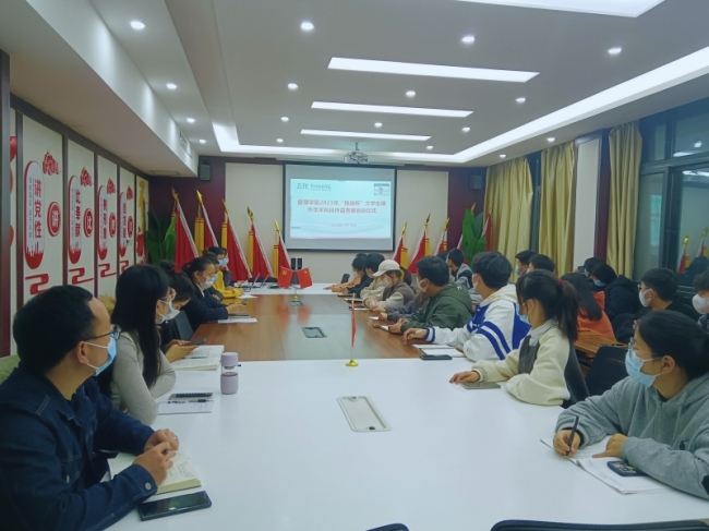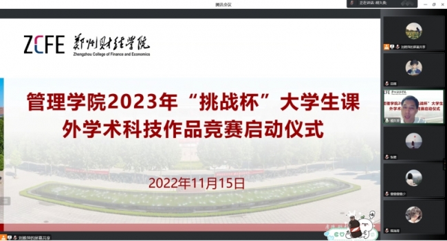 为促进学院学生自主创新能力,营造科研学术氛围,进一步发挥“挑战杯”竞赛的育人作用,加强学院师生对“挑战杯”的认识和了解,11月15日,管理学院召开2023年“挑战杯”大学生课外学术科技作品竞赛启动仪式,本次会议采取线上线下相结合的形式进行,学院全体教师及部分学生代表参加。会议由团总支书记刘雅萍主持。