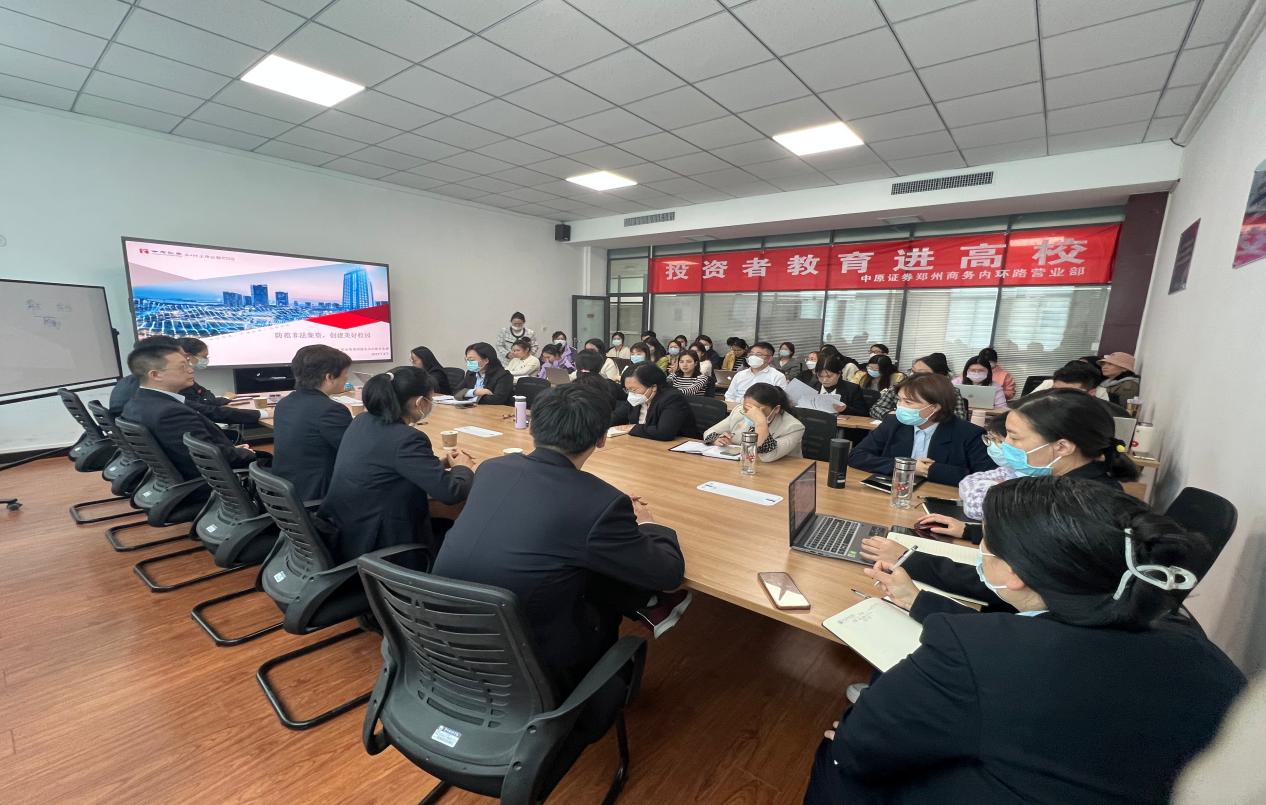 3月14日下午,中原证券郑州商务内环路营业部总经理辛志红、副总经张永红一行7人到BEAT365官网金融学院开展投资者教育进高校活动,学院全体教师参加此次活动。