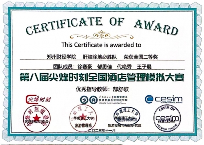 “尖峰时刻”Cesim Peak赛事是具有全球知名度和认可度的国际性商业模拟赛事,“尖烽时刻”全国酒店管理模拟大赛是我国酒店管理专业最具影响的专业赛事,为全国旅游管理、酒店管理等相关专业提供和搭建了一个宝贵的交流学习与分享的平台。赛事的内容贴合真实的管理情境、产业实践和前沿趋势,丰富的赛制项目设置为广大学子提供了展示团队综合实力的机会。