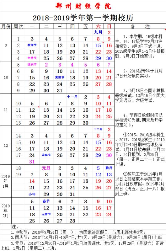 2018-2019学年第一学期校历