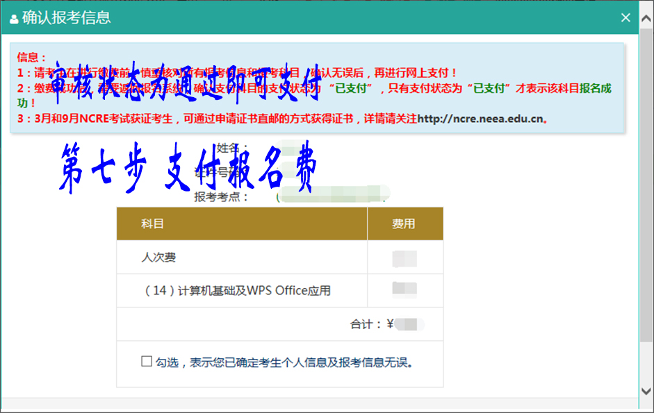 第六步:根据流程,核对自己的报名信息,报考科目等等。