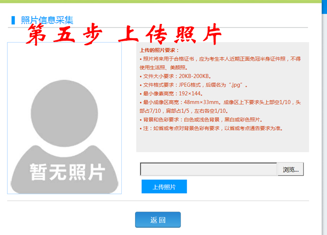 照片应为考生本人近期正面免冠彩色证件照,建议背景为白色或浅色,照片尺寸最小为192*144(高*宽),成像区大小为48mm*33mm(高*宽)。照片文件应为jpg格式,照片文件大小要求:20KB-200KB。不允许上传侧置或倒置的照片。