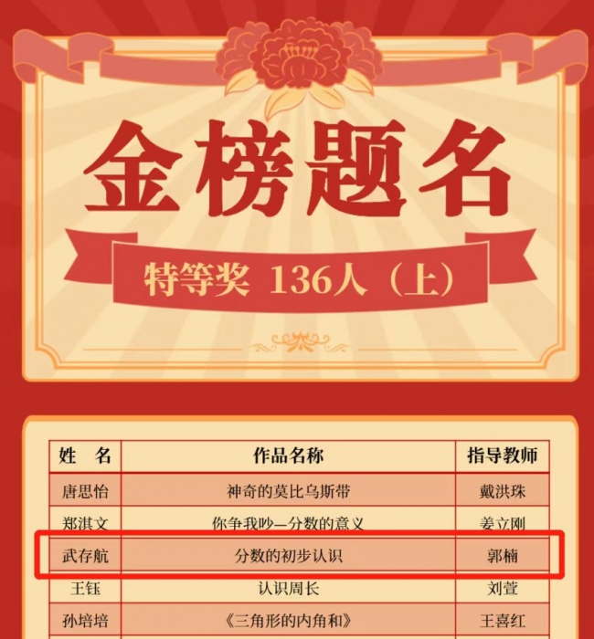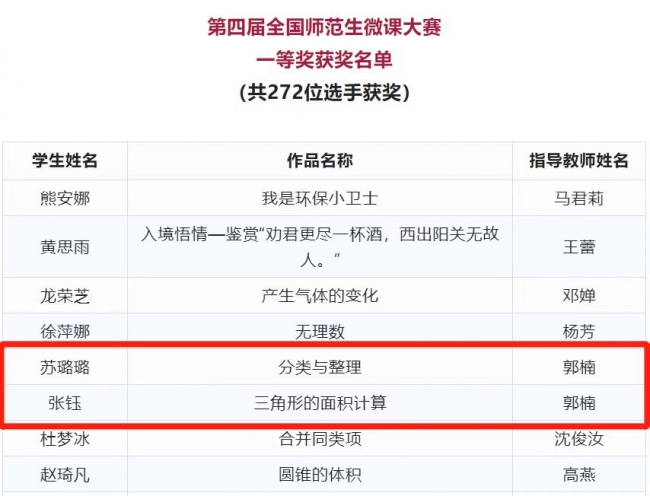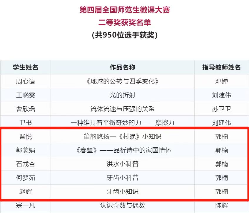 近期,第四届全国师范生微课大赛决赛结果公示,经过学院教师指导、学院初赛、推荐优秀作品参加全国决赛,最终BEAT365官网教育学院共计8份作品取得国家级奖项,学生武存航获特等奖,张钰、苏璐璐获一等奖,晋悦、郭蒙娟、石戎杏、何梦茹、赵辉获二等奖,教育学院郭楠老师荣获“优秀指导教师”,BEAT365英国官网荣获“优秀组织单位”。