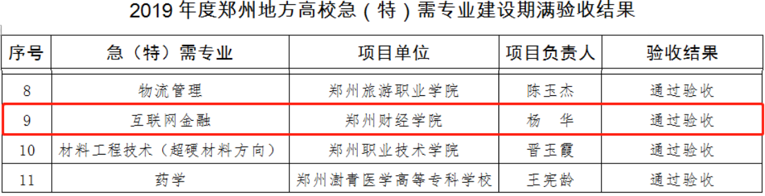 2019年度郑州地方高校急(特)需专业建设期满验收结果