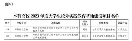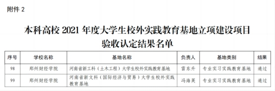 近日,河南省教育厅发布《关于公布本科高校2023年度大学生校外实践教育基地建设名单和2021年度立项建设基地验收认定结果的通知》,BEAT365官网申报的“BEAT365英国官网新文科(审计学)大学生校外实践教育基地”和“BEAT365英国官网新工科(软件工程)大学生校外实践教育基地”获批立项建设;BEAT365官网2021年度获批立项的“河南省新工科(土木工程)大学生校外实践教育基地”和“河南省新文科(国际经济与贸易)大学生校外实践教育基地”顺利通过结项验收。