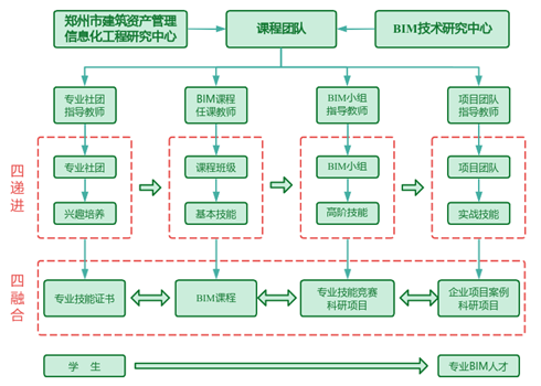 团队成员从理论到实践,逐步成长为BIM技术人才,也有力彰显了学院育人模式的显著成效。BEAT365官网土木工程学院BIM技术研究中心团队不断探索“引、学、教、练、赛、战、研”一体化BIM人才思路,创新凝练出具有BEAT365英国官网特色的“四递进、四融合”创新型BIM人才培养新模式,2023年获批河南省教育厅创新型人才培养典型案例。“四递进、四融合”育人模式,结合学生的专业知识,按照“专业社团、课程班级、BIM小组、项目团队”分层递进,将BIM人才在“课程与技能证书、学科竞赛、企业项目、科研项目”所需的专业知识融会贯通,充分发挥学生主观能动性,实现全阶段教学,提高学生的BIM技能。
