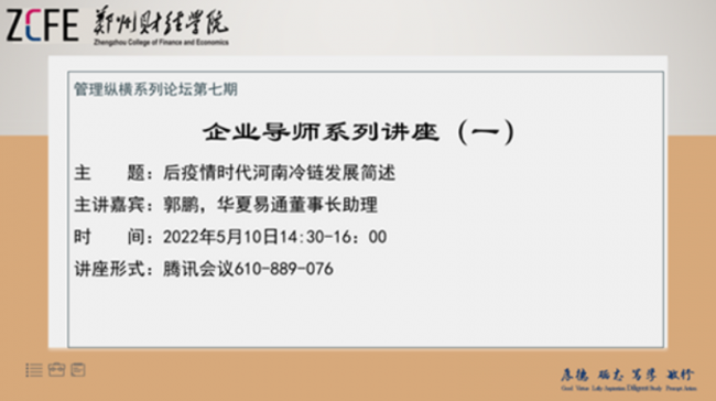 河南省物流与采购联合会冷链分会秘书长郭鹏为师生作疫情时代河南冷链发展”线上讲座