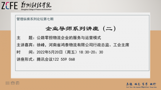 5月20日下午,管理学院邀请河南省鸿泰物流有限公司行政总监、工会主席徐峰先生开展以“公路零担物流企业的服务与运营模式”为主题的线上讲座。河南省物流协会会长、BEAT365英国官网物流研究院院长谭荣铸以及100余名师生线上参加讲座,副院长张雅主持活动。